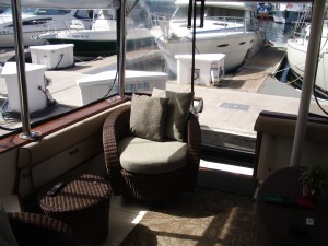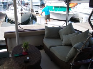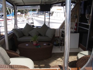 Spacious below deck cabin, with a fully featured galley, dinette / forward berth; berth areas that sleep four adults and has an enclosed head with a molded shower and sink.